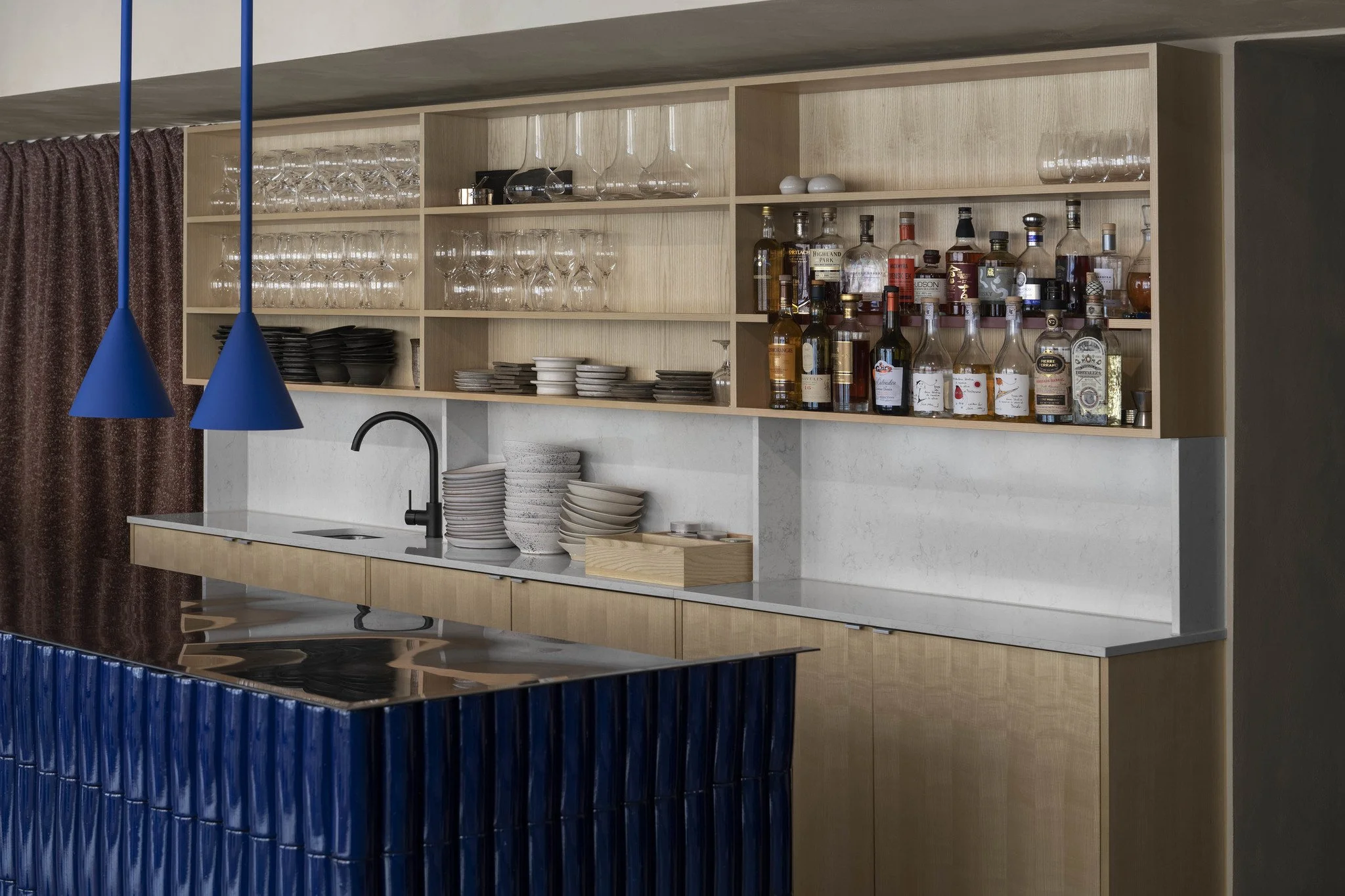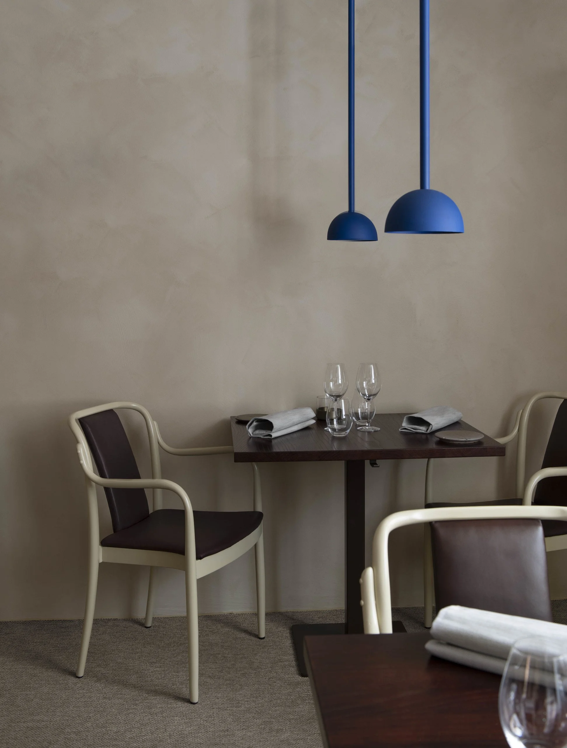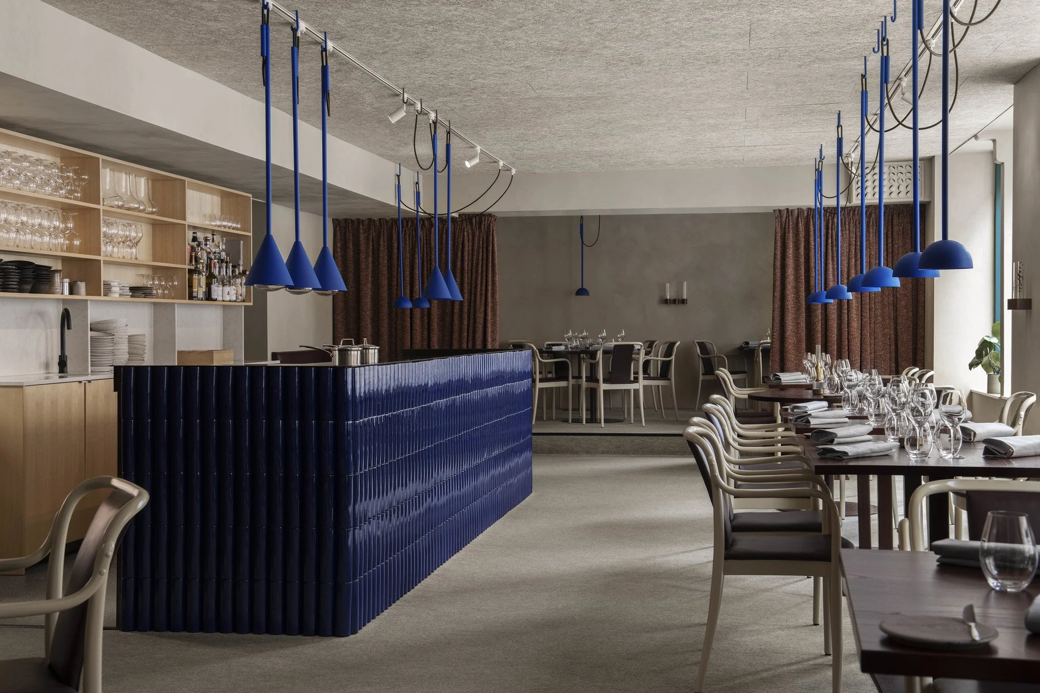 The architects task was to create a simple yet warm ambience that would act as a backdrop for Martin Moses’s cooking. In the intimate space, the counter where Moses composes the food becomes the focus point of the dining room. The counter is covered with cobalt blue, curved tiles a color also found in the custom made, movable pendant lamps above the tables.