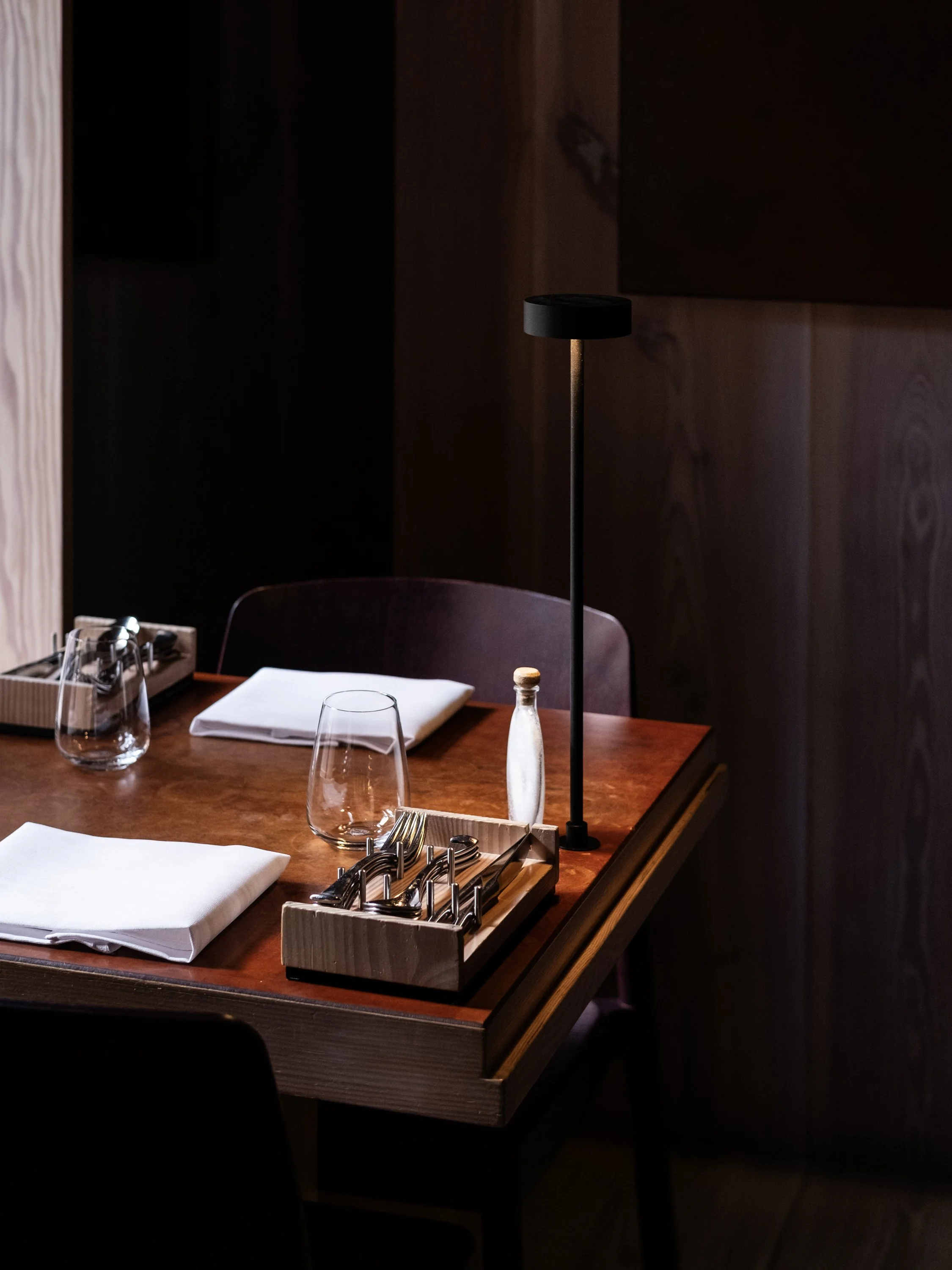 Tables, with integrated lighting, are made of the same wood and the tops are covered with thick leather. Utensils are placed on platforms of pine and rocks from a local beach.
