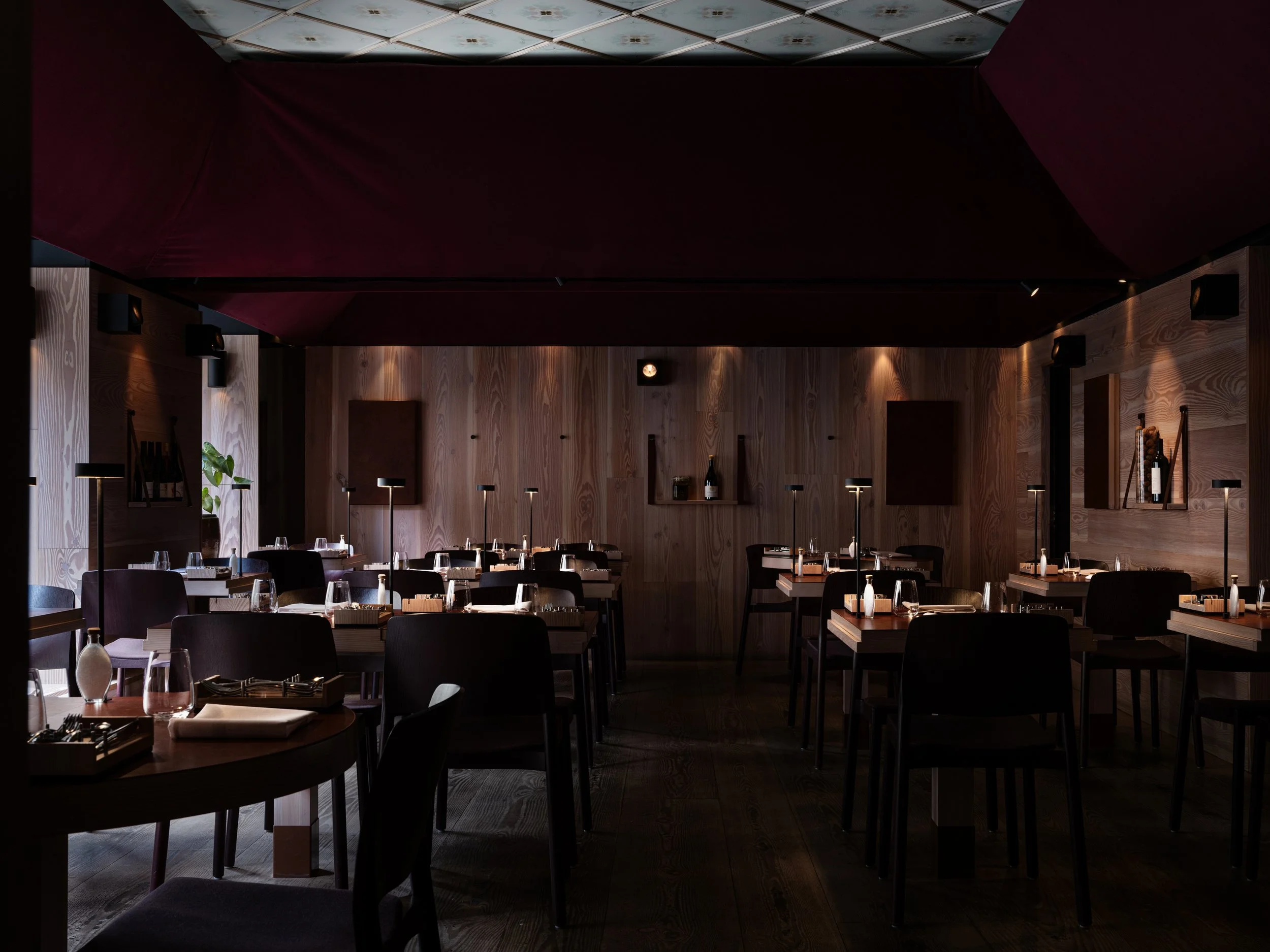 Koka is a composition of surfaces blending sound, texture and light. Only a few materials are used: wide planks of douglas fir are mounted on the floor and on the walls, wine red textile passpartouts made of soft fabric act as sound absorbers and are framing the old reflective glass ceiling.
