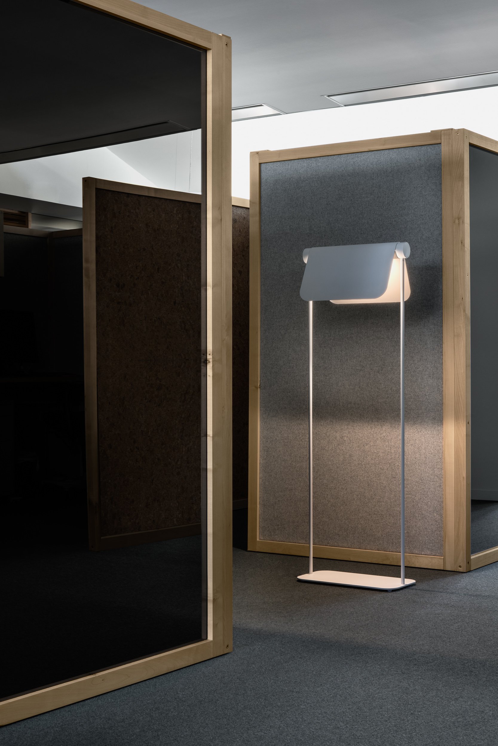 With the inspiration of a folded paper sheet resting on a paper tube, the depth of the shades creates a near glare free light with an even lightdistribution directed downwards.