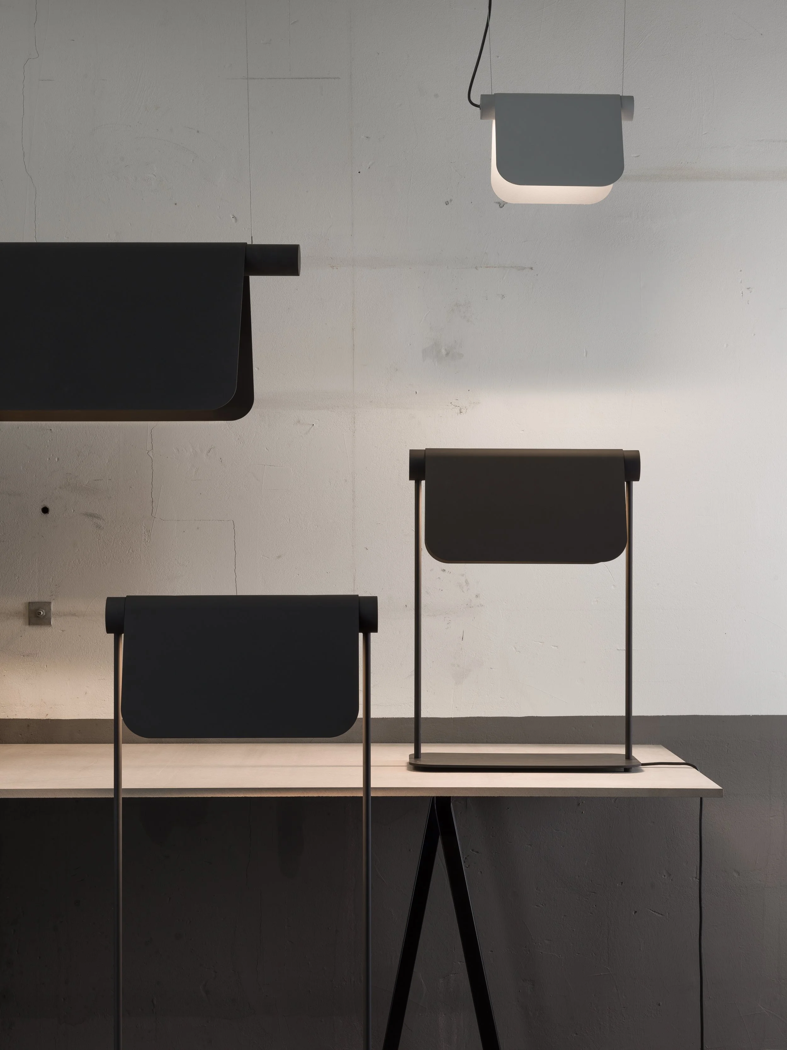 Inspired by the shape of a folded paper sheet, the Bend family consists of pendant-, floor- and table luminaires with a diffuse light distribution directed downward.