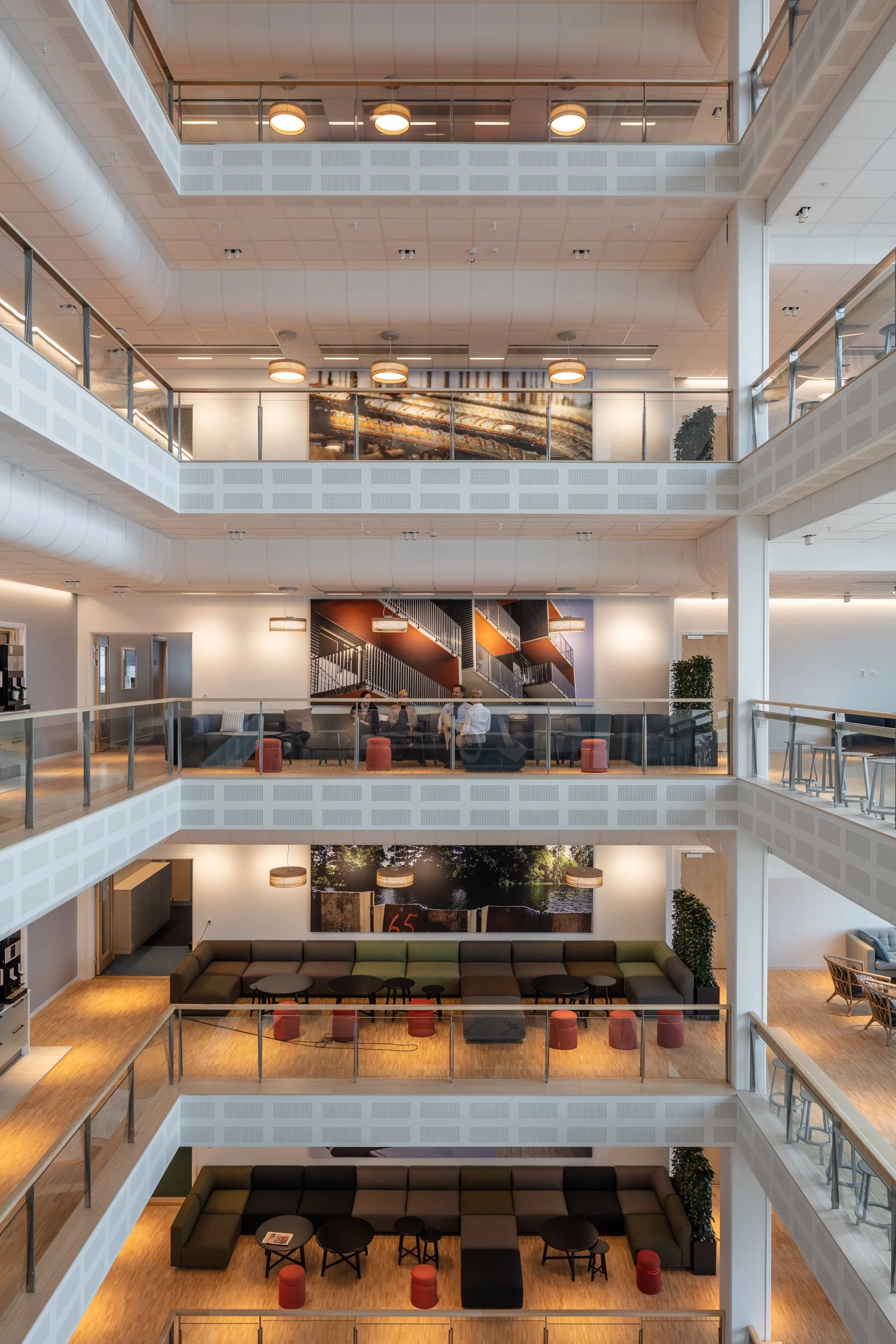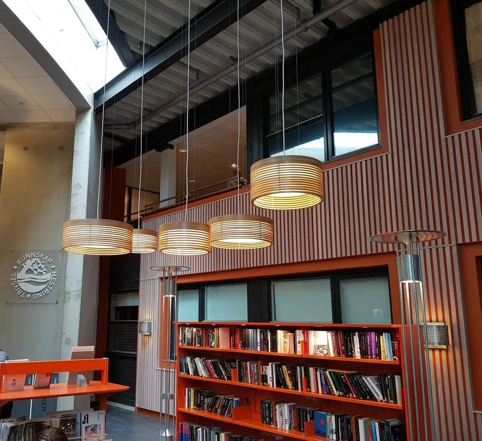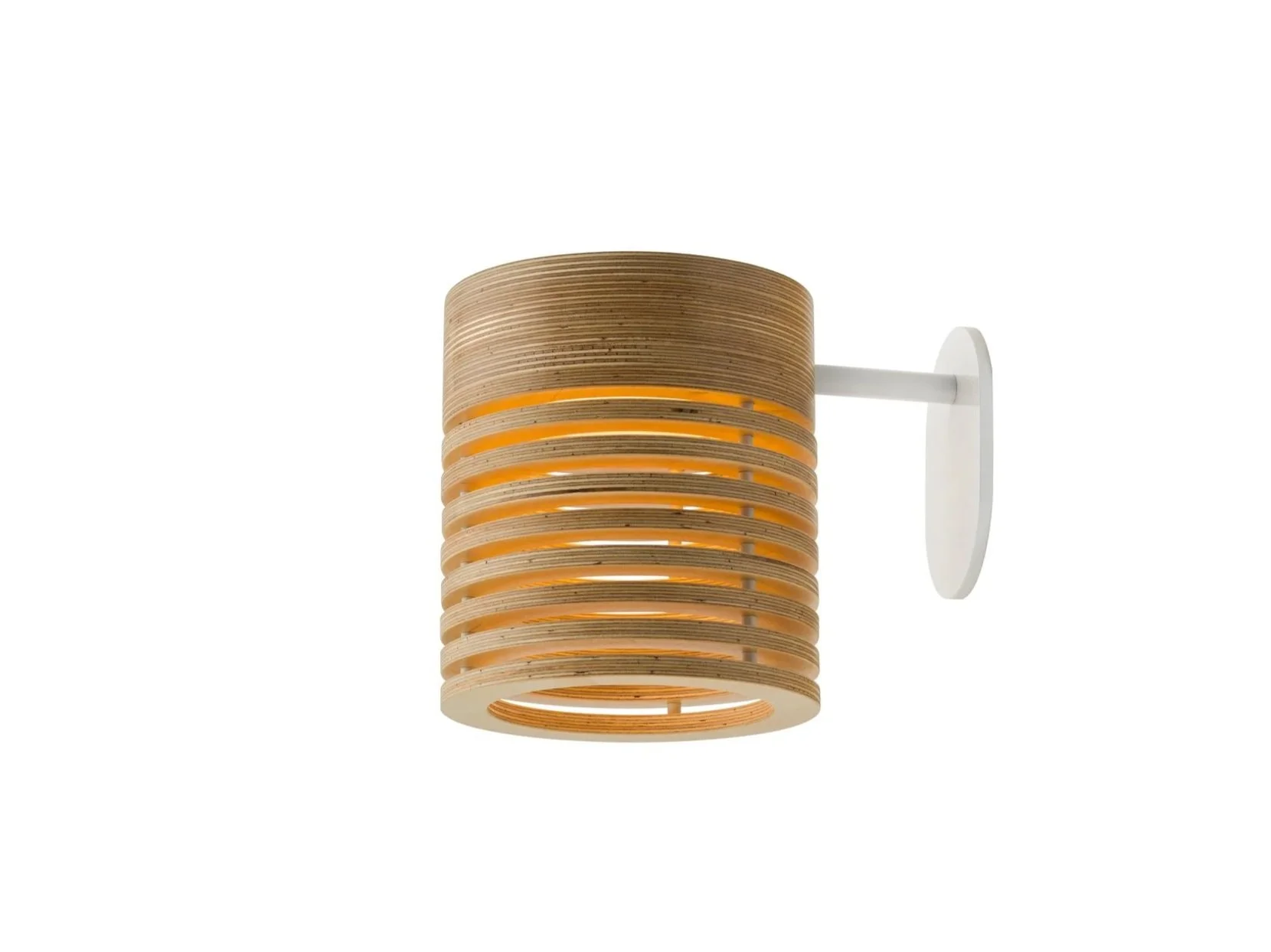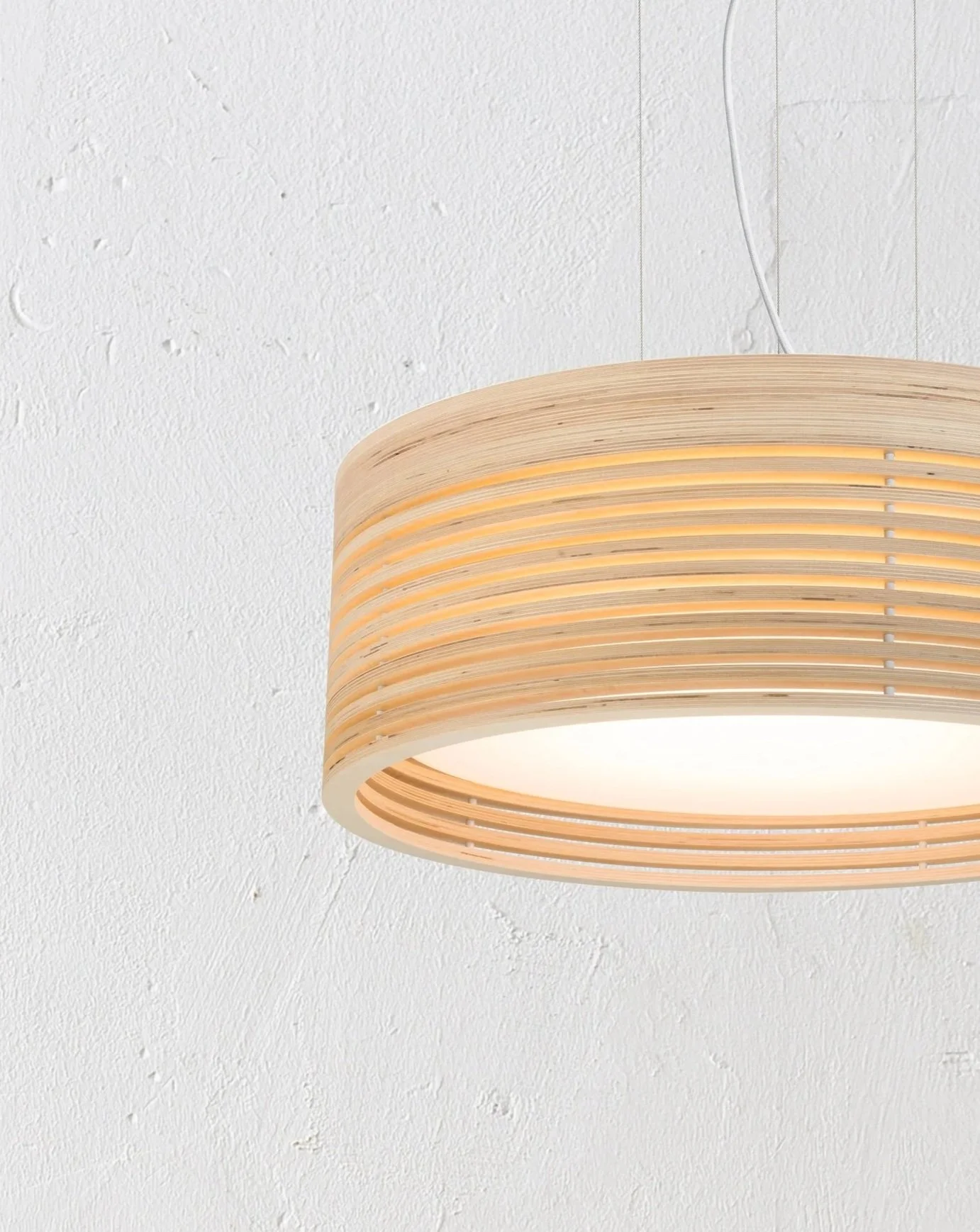 Lamellaes of birch plywood filters the light, creating a soft and warm ambience.