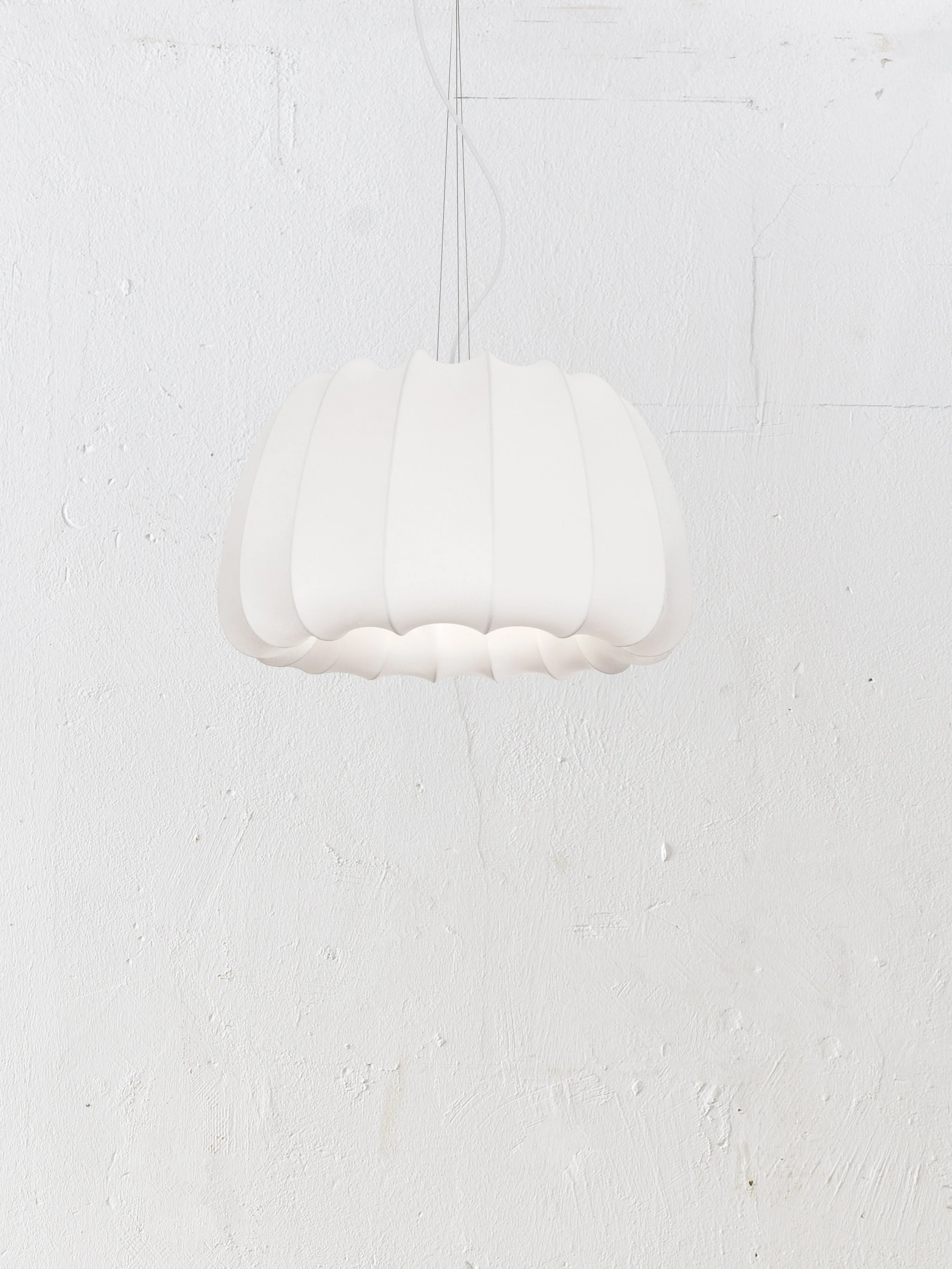 A stretch textile covers a metal body, creating voluptuous body, with the lightsource hidden deep within behind a rounded acrylic diffuser.